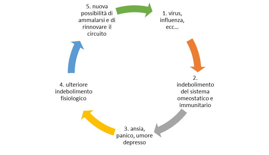 La conseguenza diretta dei sintomi invalidanti è dovuta ad un indebolimento del sistema immunitario e delle risorse energetiche del nostro copro che, come risultato, portano ad accusare debolezza e stanchezza. Tale debolezza viene “decifrata” a livello cognitivo e somatico come malessere ed ansia per vari motivi: quando siamo stanchi ci sentiamo affaticati, respiriamo male, abbiamo più sonno, il cuore va in tachicardia o in bradicardia, ci sentiamo le gambe pesanti e rigide così come le braccia, la testa pesante o dolorante. Tutte queste manifestazioni fisiologiche scatenano in noi reazioni di “paura” e molto spesso anche di “terrore”.